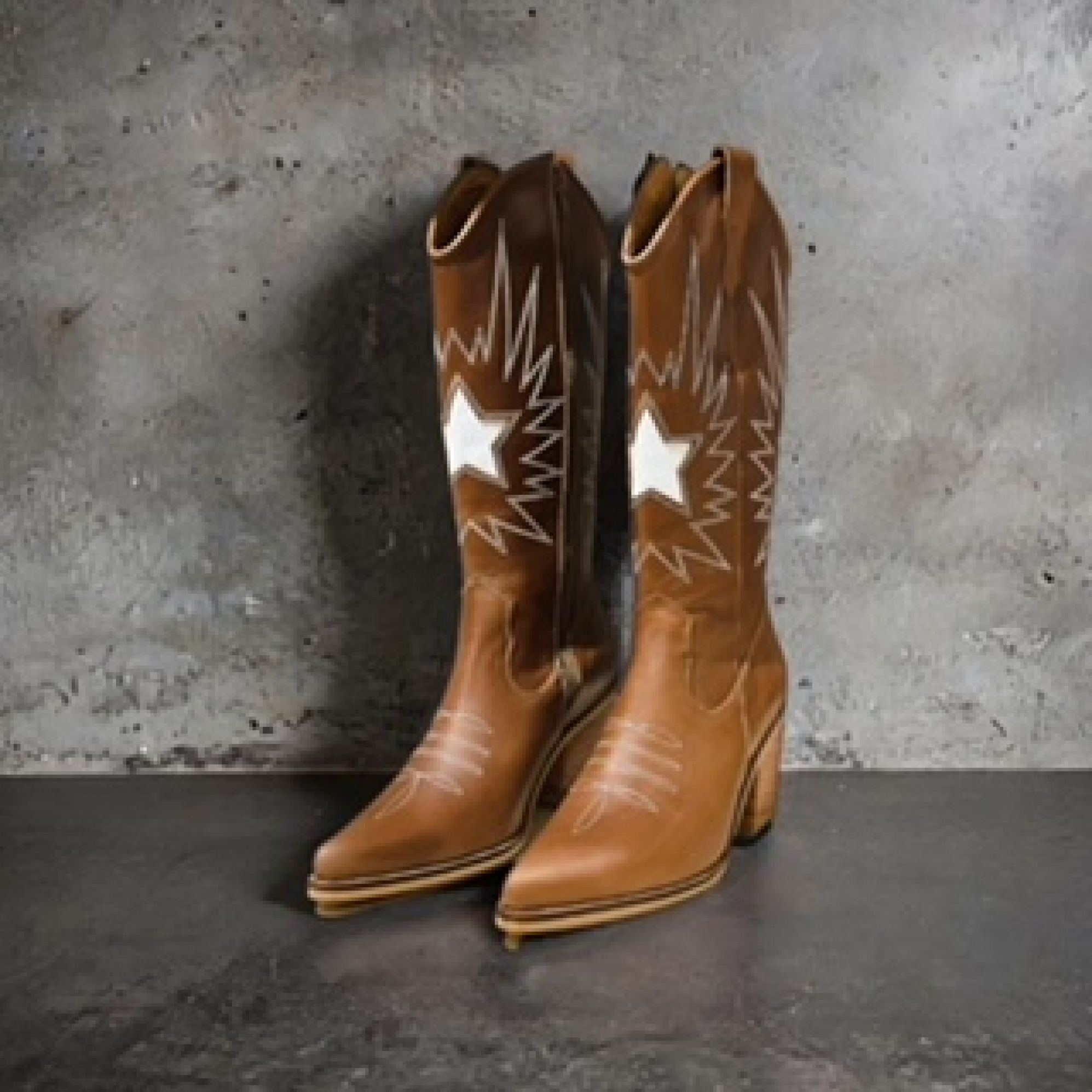 Bota texana de cuero color camel con detalles en blanco, 38 cm de largo , taco 8 cm, cierre. bota atemporal, para usar todo el año. 100% cuero por dentro y por fuera.