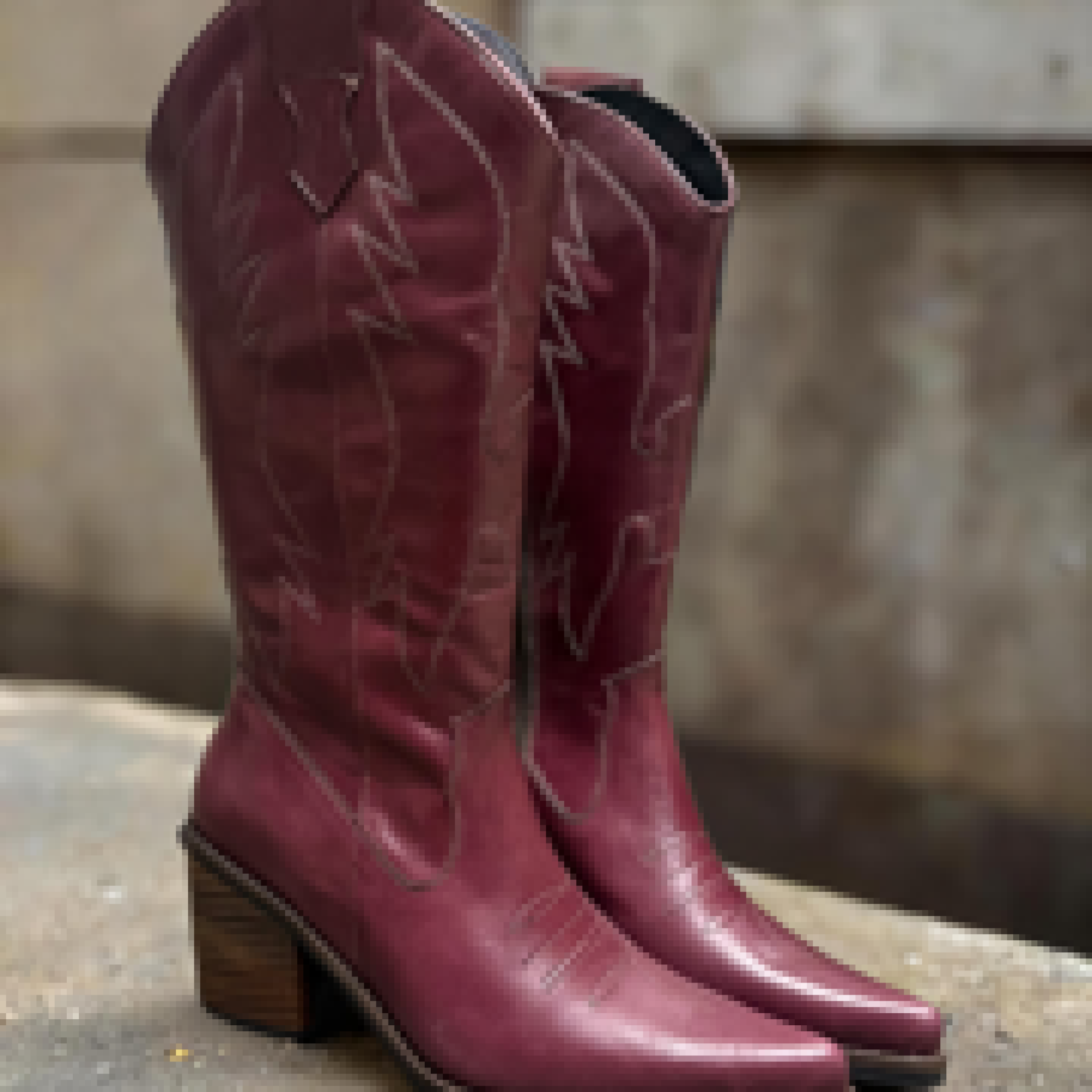 Bota Lusitana color burdeo con bordados, al tono. Sin lugar a dudas un espectáculo de bota. 100% cuero, taco 7 cm