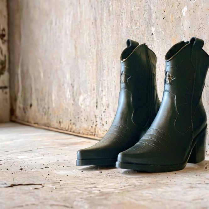 Botín Lusitano color Blanco invierno, con trabajo de desgaste a mano, lo que lo hace muy sobrio, elgante y unico. un botín estilizador por su corte vaquero, detalles y aplicaciones en color camela, bordados y aplicacion al tono