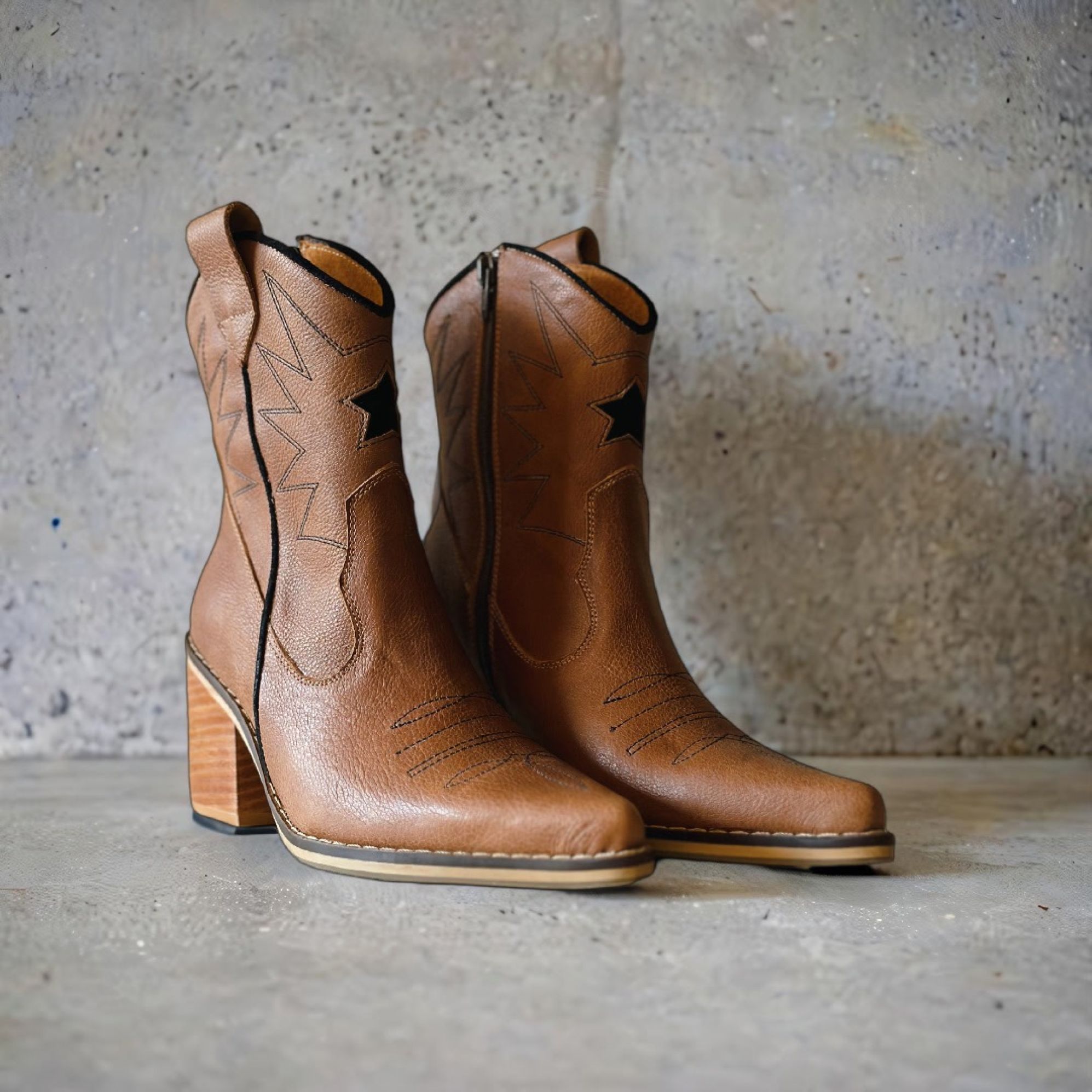 Botin Lusitano color camel, un botín muy elegante y estilizado por su corte vaquero, detalles y aplicaciones en negro, bordados y estrella al tono